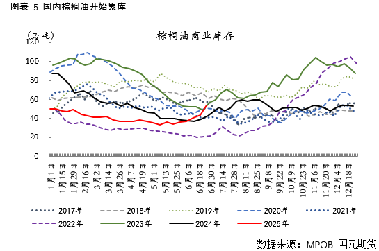 国内市场上,近日棕榈油进口成本持续回升,根据Mysteel统计,截止到 7 月 10 日棕榈油 8 月船期离岸价为 1005 美元/吨,较上周涨 17.5 美 元/吨;进口到岸价为 1035 美元 /吨,较上周涨 17.5 美元/吨;进口成本价为 8883 元/吨,涨 177 元/吨;对盘利润为-231 元/吨,较上周跌 3 元/吨。最新一周无新增买船,不过近期进口棕榈油到港速度加快,但性价比偏低,未能有效提振需求,交投氛围清淡。据 Mysteel 统计,本周全国重点油厂棕榈油成交量 983 吨,较上周减少 2349 吨,减幅 70.50%。库存来看,截至2025年7月4日(第27周),全国重点地区棕榈油商业库存53.51万吨,环比上周减少0.23万吨,减幅0.43%;同比去年47.31万吨增加6.20万吨,增幅13.1%。