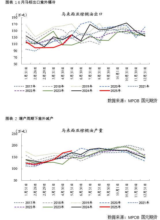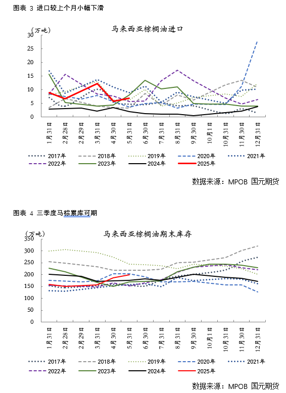 2025年7月10日,马来西亚棕榈油局(MPOB)发布了6月月度供需报告,数据显示,马来西亚棕榈油产量为169.23万吨,环比下降4.48%,符合市场预期,但低于5月的177.2万吨。出口量为125.94万吨,环比下降10.52%,远低于路透预期的144.5万吨。进口量为7万吨,环比增加1.51%,国内消费量为45.5万吨,环比增加43.98%。期末库存为203.06万吨,环比增加2.41%,高于市场预期的198.5-200万吨。