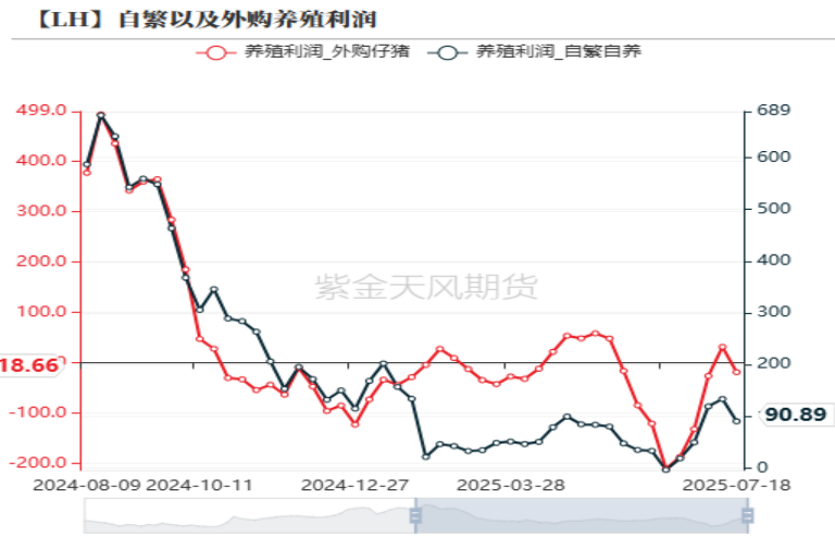截止到2025年7月18日自繁自养盈利90元/头;外购仔猪养殖盈利-18元/头,7月以来生猪价格呈现持续回调,养殖利润也跟随回落,但都处于盈利状态,其中因一季度补栏仔猪价格较高,因此外购仔猪利润低于自繁自养的利润。近期玉米及豆粕价格偏强震荡,养殖成本增加,抬升远期猪价的底部支撑区间。