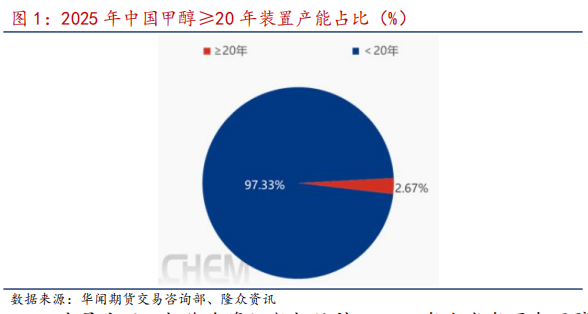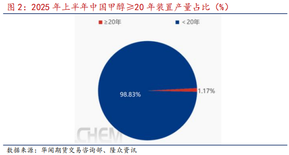 而产量方面,据隆众资讯数据统计,2025年上半年国内甲醇≥20年装置实际产量共计59.28万吨,在上半年总产量中占比只有1.17%。