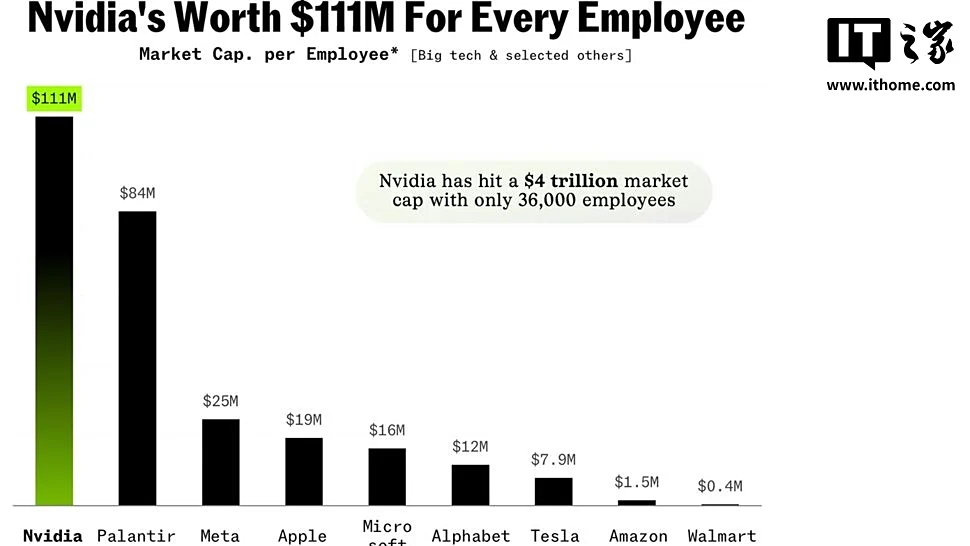 英伟达成全球首家市值突破4万亿美元的公司,员工人均贡献1.11亿美元市值
