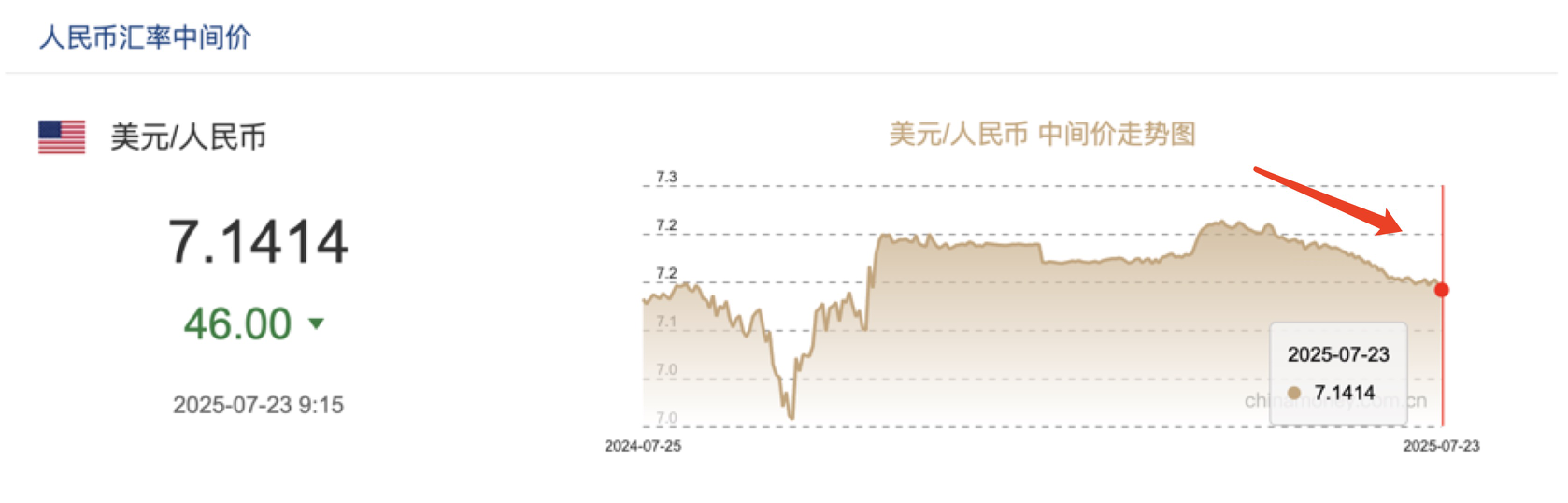 7月23日,中国人民银行授权中国外汇交易中心公布,当日银行间外汇市场人民币汇率中间价为1美元对人民币7.1414元,相较前一交易日中间价7.1460元,调升46基点,创2024年11月5日以来最高。