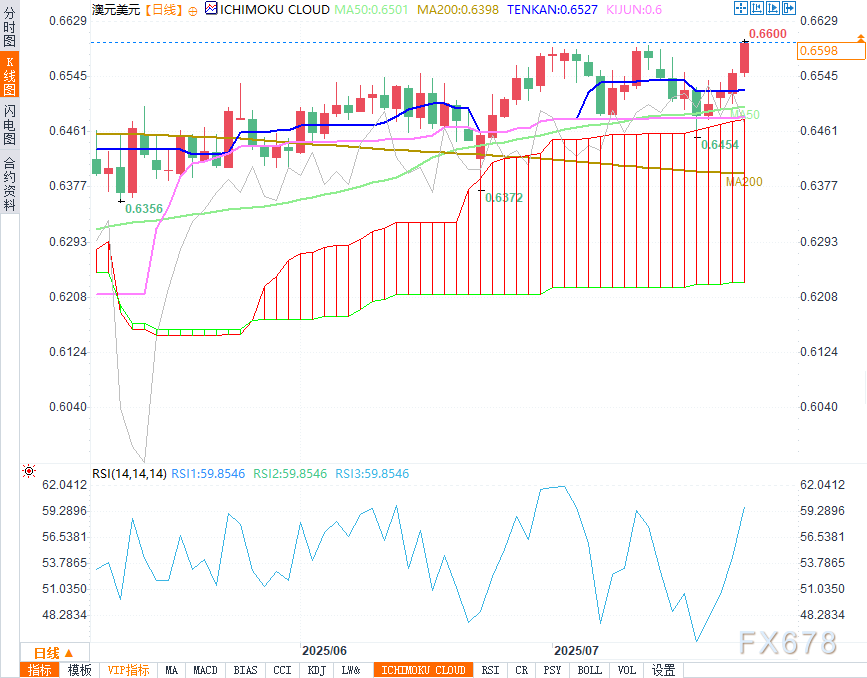 澳元/美元维持坚挺基调,并在周三进一步加速上涨,将最新的牛市阶段延续至第四个交易日。受美日贸易协议宣布提振新增风险偏好影响,该货币对触及逾一周最高水平。