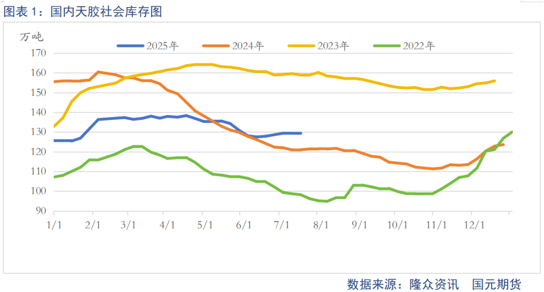 海关总署7月14日公布的数据显示,2025年6月我国进口天然橡胶及合成橡胶(含胶乳)59.9万吨,较2024年同期的47.1万吨增加27.2%。2025年的1—6月,我国进口天然橡胶及合成橡胶(含胶乳)407.5万吨,较去年同期的328.4万吨增加24.1%。与此同时,国内下游轮胎需求增量有限,天然橡胶社会库存呈现季节性回升趋势,制约了短期价格的反弹空间。截至7月13日当周,我国天然橡胶社会库存量为129.5万吨,为6月底以来的高点,较前一周增加0.18万吨,增幅为0.14%,且远高于2024年同期水平。