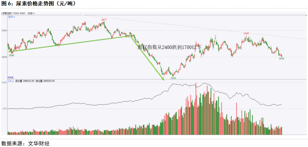 这波尿素的下跌行情可以分为两段。第一段为5月之前的震荡下跌,第二段为五月之后的快速下跌。第一段集中了各种利空,一方面尿素在高利润下企业产量大幅提升至高位水平,供应同比出现大幅增长。而需求端受外盘大跌影响,出口倒挂,出口已无利多故事可讲。国内方面,地产持续走弱,工业需求尽显疲态,三聚氰胺利润与开工都走至低位水平。另外一方面,除尿素外其他化肥品种已经出现大幅下跌,尿素合成利润涨至历史高位,与合成氨比价大幅抬升,相对比之下,尿素估值持续处于高位水平,市场对于尿素的看空情绪也逐渐走高。第二阶段,也是就是5月之后,随着港口煤炭库存的快速走高与外盘低价货物的冲击,煤炭开启大跌模式,煤化工成本端坍塌,加上宏观情绪转弱,尿素开始大幅流畅下跌。