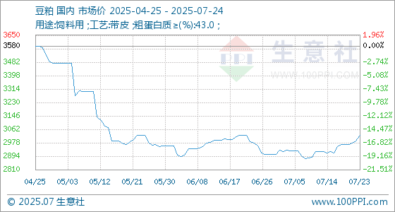 7月24日,生意社豆粕基准价为3024.00元/吨,与本月初(2906.00元/吨)相比,上涨了4.06%。