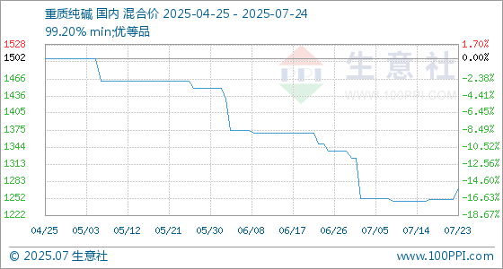 7月24日,生意社重质纯碱基准价为1270.00元/吨,与本月初(1325.00元/吨)相比,下降了4.15%。