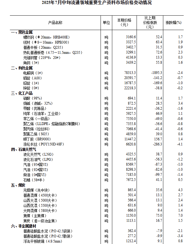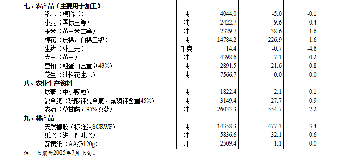 7月24日,国家统计局消息,据对全国流通领域9大类50种重要生产资料市场价格的监测显示,2025年7月中旬与7月上旬相比,28种产品价格上涨,20种下降,2种持平。其中,生猪(外三元)跌4.6%。