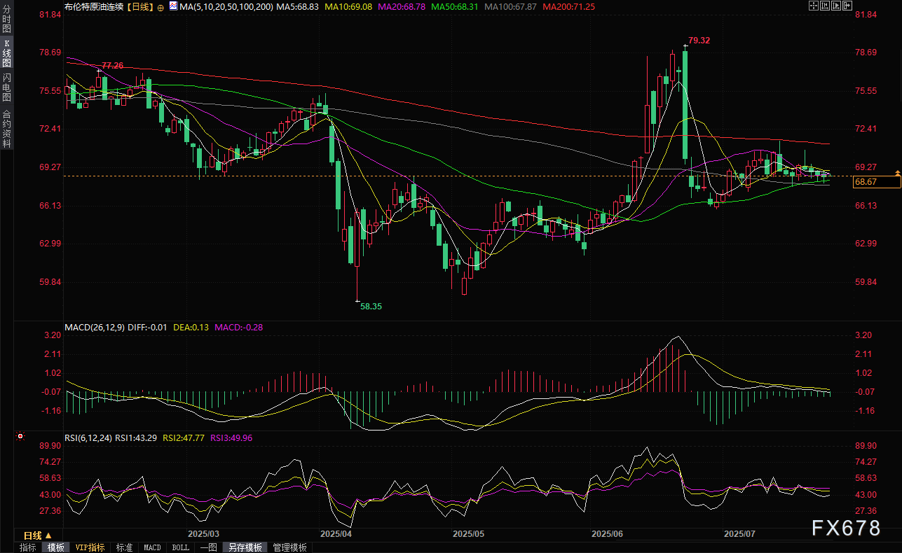 汇通财经APP讯——在经历连续三日低迷后,周四(7月24日)美布两油仍坚守在100日均线上方,美原油目前上涨0.4%,交投于65.46附近;布伦特原油目前上涨0.1%,交投于68.67美元/桶附近,贸易谈判曙光、库存超预期下滑、地缘政治博弈三大引擎同时点火,油价出现企稳迹象,让多头“嗅”到了久违的反弹机会。