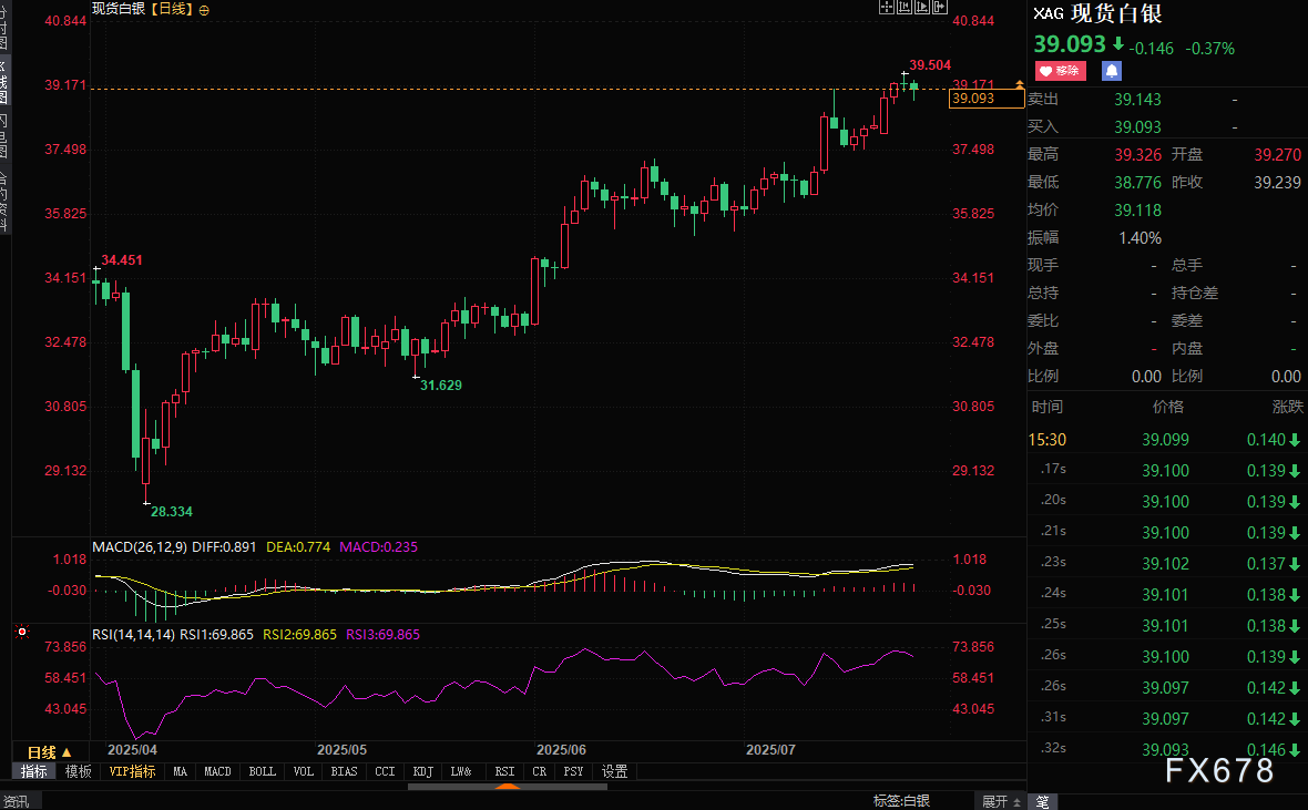 汇通财经APP讯——周四(7月24日)亚欧时段现货白银震荡下跌约0.4%,目前交投于39.07美元/盎司附近,近期走势强于黄金,Macd,Rsi位置处于看涨区间。