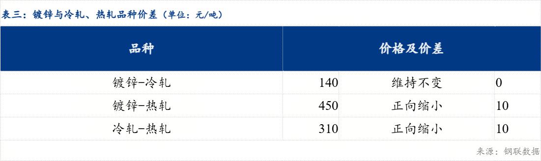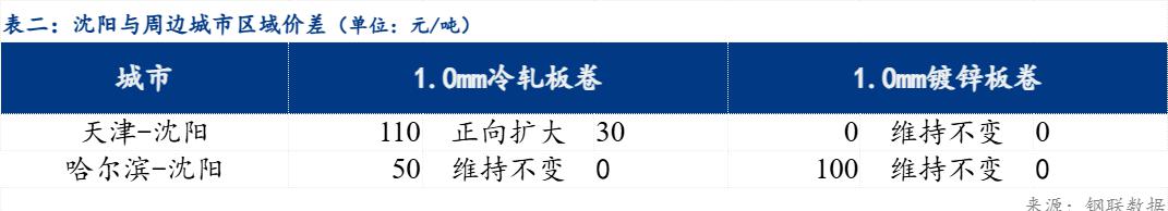 区域价差来看,天津-沈阳冷轧板卷区域价差正向扩大30元/吨,沈阳-哈尔滨冷轧板卷区域价差维持不变;天津-沈阳镀锌板卷区域价差维持不变,沈阳-哈尔滨镀锌板卷区域价差维持不变。品种价差来看,镀冷品种价差维持不变;镀热品种价差缩小10元/吨;冷热品种价差缩小10元/吨 。