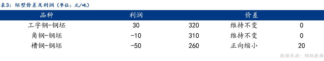 从品种价差来看,今日唐山钢坯与工字钢、角钢价差维持不变,与槽钢价差正向缩小。