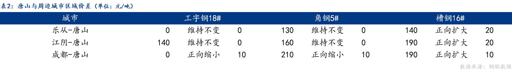 从区域价差来看,今日唐山与乐从、江阴工字钢、角钢价差维持不变,与槽钢价差正向扩大;与成都工字钢、角钢价差正向缩小,与槽钢价差正向扩大;