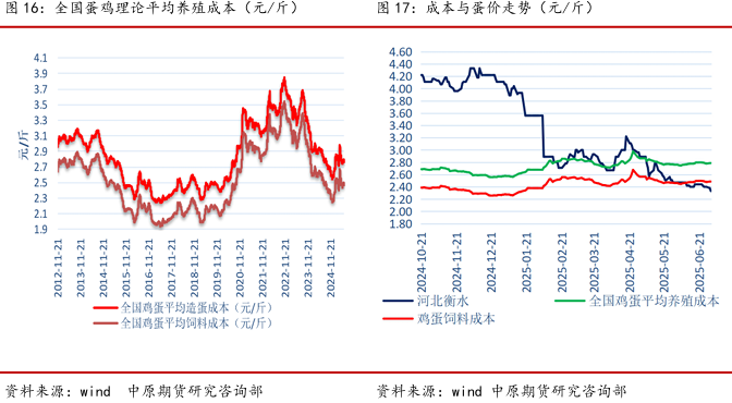 2025 年上半年,整体饲料价格走势分化,玉米价格震荡走强,豆粕维持偏弱运行,整体养殖成本触底反弹,维持在2.3-2.7元/斤区间震荡。整体蛋价在2月初开始整体跌破综合养殖 成本2.6元/斤左右,在5月初跌破饲料养殖成本2.3元/斤左右。