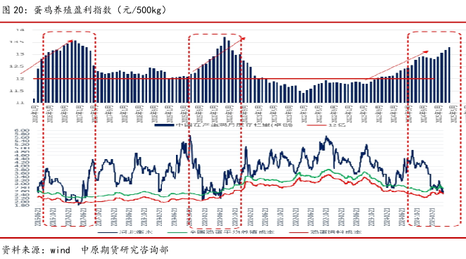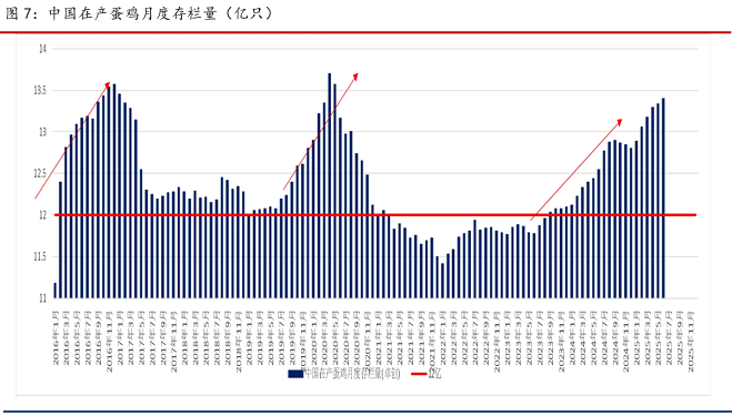 2020 年6月-2025年6月(5年):本轮周期时间偏长,尤其特殊原因,经历过2020年的 亏损后,叠加疫情,市场补栏信心大幅受挫,虽然蛋价在低存栏和生猪价格的加持下维持高 位,2020年开始,成本开始不断抬升,整体养殖利润低位运行,对补栏积极性提振有限,进 入2023年,全球通胀告一段落,饲料价格高位回落,成本不断下降,养殖利润迅速恢复,2024 年产能开始扩张,市场也提前出给了低价预期,但存栏仍旧没有达到高位,因为2014年初, 行业利润在成本继续下降的背景下维持高位,市场补栏信心仍在,2024年下半年到2025年一季度迎来一波新的补栏高峰,产能再度扩张到逼近前两个高峰,压力进一步累积,蛋价再创 新低,跌破饲料成本,行业进入深度亏损期。
