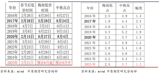 时间角度:按照季节性规律,1-2季度往往是鸡蛋低价运行时间,一般会在6月下旬,南 方梅雨尾声企稳,2025年入梅时间为6月6-8号,比较提前,出梅时间为为7月中下旬,鸡 蛋现货稳定时间逼近,中秋上涨不会缺席,剩下的就是幅度问题。