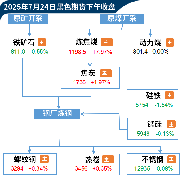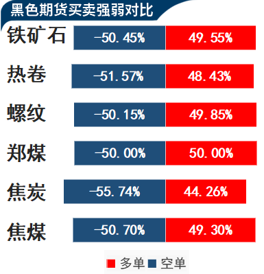今日黑色期货上涨为主,截至收盘,炼焦煤期货收1198.5,上涨7.97%;焦炭期货收1735,上涨1.97%;热轧期货收3456,上涨0.35%;螺纹期货收3294,上涨0.34%;热卷期货低开高走,震荡走高,成交减少,收小阳线;螺纹期货低开走高,震荡上涨,成交缩量,收小阳线。热卷主力合约前20成交123.42万手,减少25.12万手;螺纹钢主力合约前20成交350.70万手,减少42.20万手;