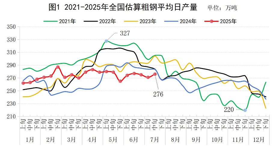 7月23日中钢协发布报告显示7月中旬,重点统计钢铁企业共生产粗钢2141万吨,平均日产214.1万吨,日产环比增长2.1%;生铁1944万吨,平均日产194.4万吨,日产环比增长0.6%;钢材2080万吨,平均日产208.0万吨,日产环比增长4.6%。据此估算,本旬全国日产粗钢276万吨、环比增长2.1%(见图1),日产生铁237万吨、环比增长0.6%,日产钢材419万吨、环比增长2.3%。