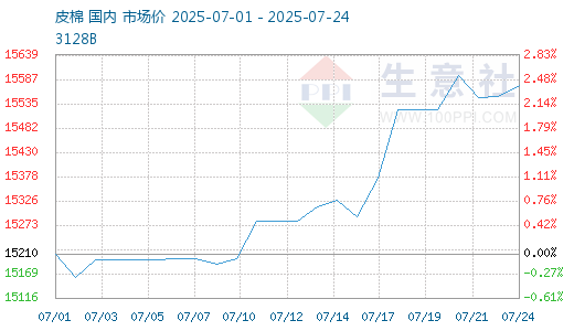7月棉价整体呈现小幅上涨趋势,主因临近末期供应趋紧同时国内宏观方面偏暖利好棉价,但下游淡季氛围下需求持续走弱,压制棉价涨幅。据生意社商品行情分析系统,截至7月24日3128B级皮棉现货价格在15573元/吨,较月初上涨2.39%。