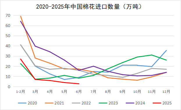 进口方面:本年度配额偏紧,进口棉量大幅减少,据海关统计数据,2025年6月我国棉花进口量3万吨,环比减少1万吨,减幅25.0%;同比减少13万吨,减幅82.1%。2025年我国累计进口棉花46万吨,同比减少74.3%。