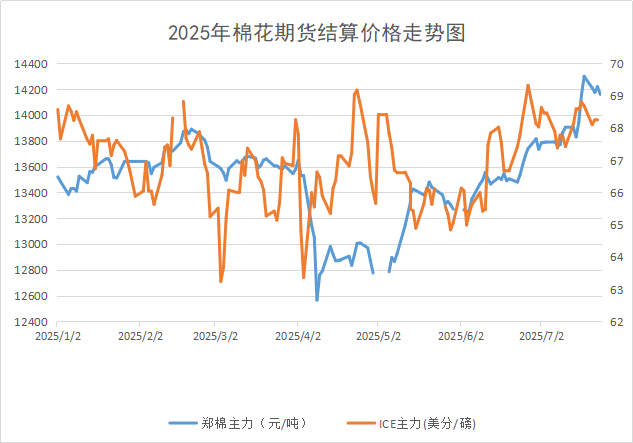 行情回顾:7月上半月,尽管商业库存减少,但2025年全国棉花实播面积4580.3万亩,同比增加270.7万亩,增幅6.3%,实播面积高于此前预期。下游库存持续累积,纺纱开机率持续下降背景下,棉价呈现窄幅震荡走势。到了下半月,棉花商业库存尤其是新疆库存下降幅度较快,加上新疆地区天气风险对产量预期的扰动,叠加2025年配额暂无明确消息,进口看减,供应偏紧预期明显下,郑棉主力合约大幅上涨,带动现货行情走高。