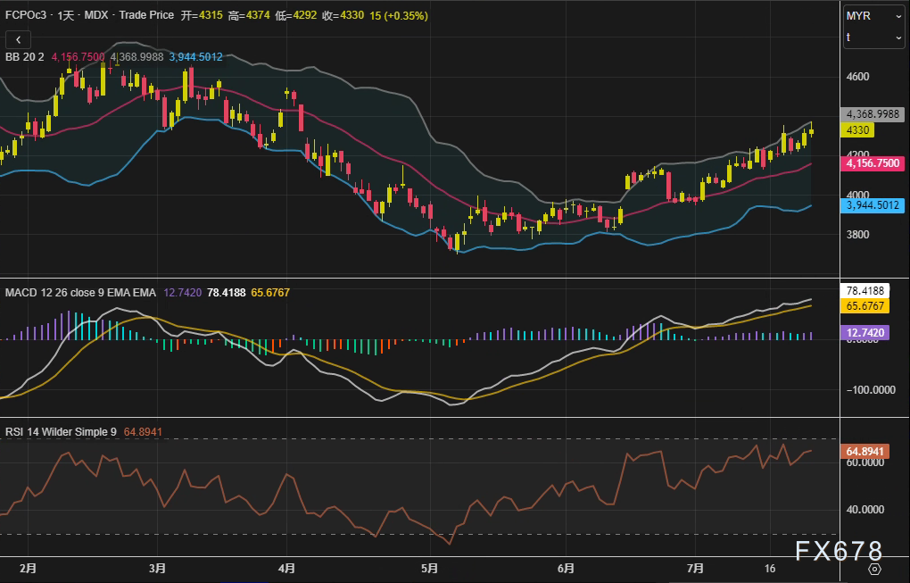 从技术面看,当前棕榈油价格仍处于布林通道中轨(4156林吉特)与上轨(4369林吉特)之间,MACD指标虽维持金叉但柱状线收窄,RSI(14)报64.89,接近超买区域,显示短期可能存在回调压力。