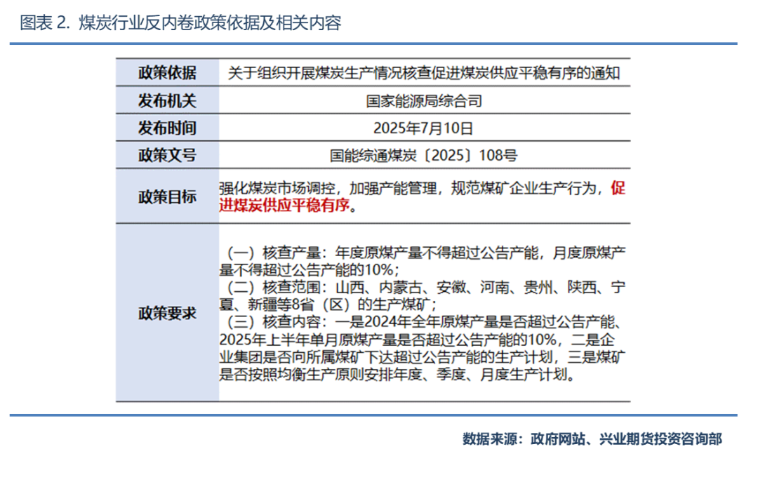 2025年7月1日,中央财经委员会第六次会议召开,“反内卷”政策关注度得到明显提升;7月10日,国家能源局综合司发布《关于组织开展煤炭生产情况核查促进煤炭供应平稳有序的通知》,煤炭行业开启反内卷。