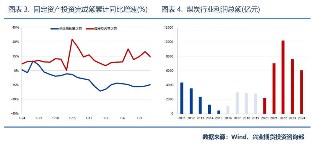 另外,根据煤炭行业利润总额的变动亦可知,供给侧改革开始之前,由于产能的过剩及行业处于下行周期,煤炭企业利润不断缩减,企业经营面临营业收入及利润增长的双重下滑;而煤炭反内卷开始之前,基于过往3至4年较高的煤炭价格,企业积累了丰厚的利润,整体经营压力相较供给侧改革时期较小。