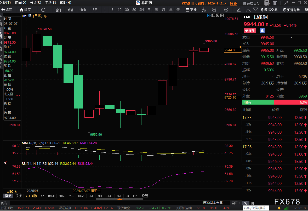 北京时间17:58,LME铜价现报9949.00美元/吨。