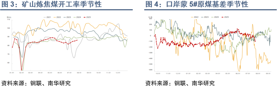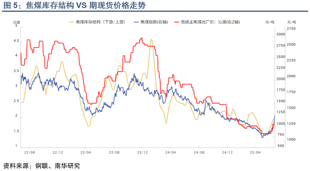 近期,因环保、顶库等原因减停产的煤矿陆续复产,但国产炼焦煤开工率暂未恢复至5月高点。盘面反弹带动期现投机需求,焦煤现货快速涨价,刺激下游焦化厂补充原料库存。期现锁货+刚需采购提振煤焦短期需求,部分显性库存转移至表外,焦煤现货流动性收紧,库存结构明显改善。