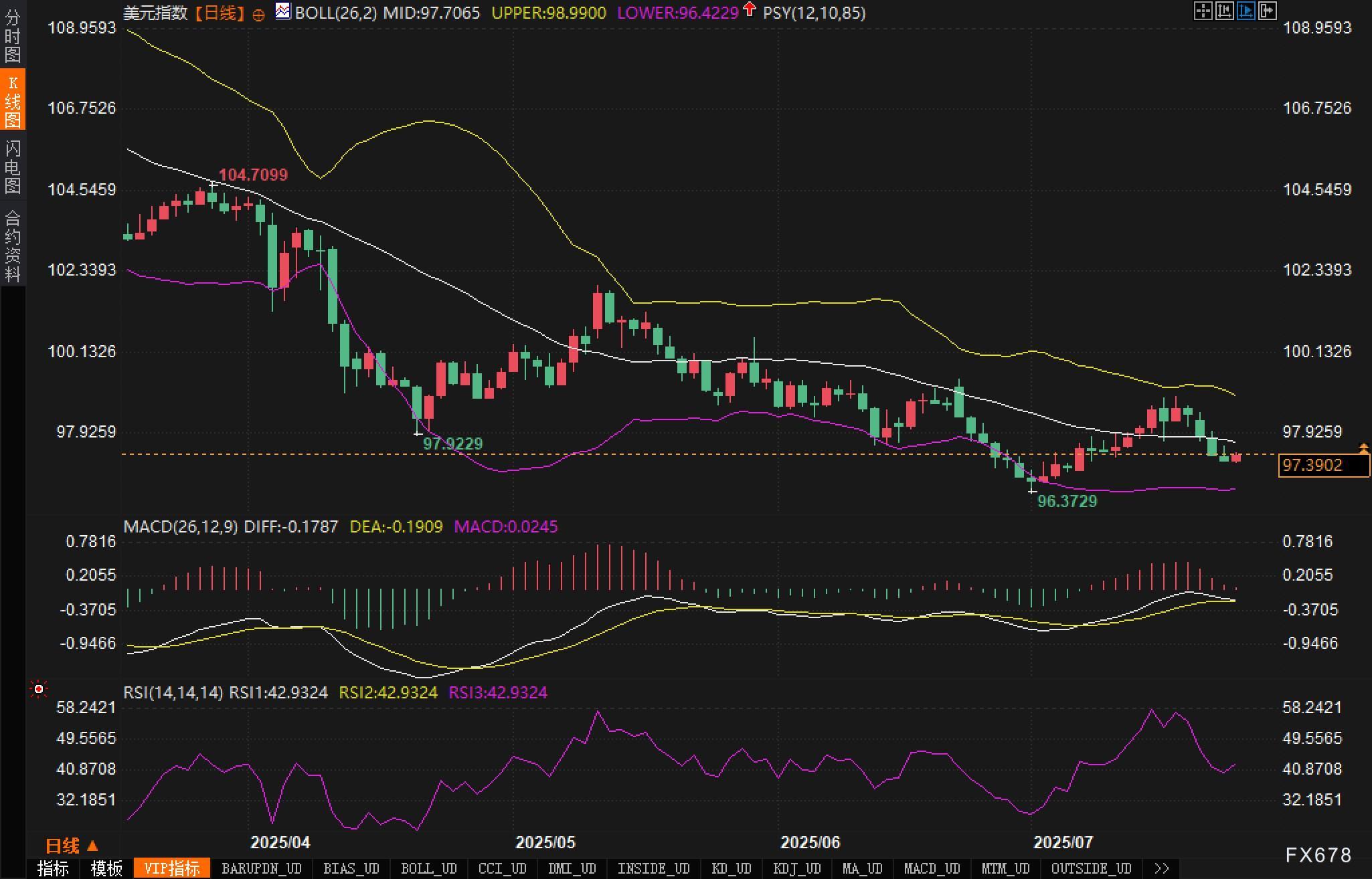 从日线图看,美元指数自高点104.70以来已呈现明确下降趋势,当前价格运行于布林带中轨与下轨之间,布林带逐步收敛,反映波动率趋缓。前期一度探底至96.37,构成短期反弹起点,但反弹至布林中轨附近(当前97.70附近)后屡遭压制,显示上攻动能不足。