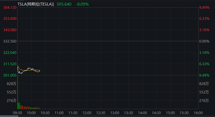 特斯拉周四盘初一度大跌超9%,尽管盘初跌幅一度收窄至6%左右,但随后再次扩大,目前跌超8%。