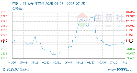 7月25日,生意社甲醇基准价为2459.17元/吨,与本月初(2805.00元/吨)相比,下降了12.33%。