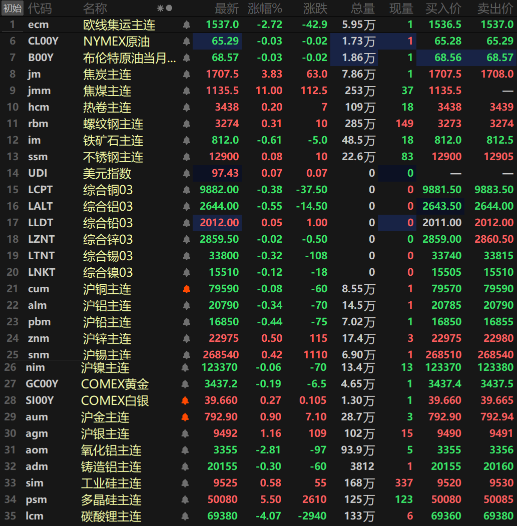 此外,碳酸锂主连跌4.07%,工业硅主连涨0.58%,多晶硅主连早些时候一度拉升涨停,但随后涨幅略有收窄,收盘涨5.5%。欧线集运主连跌2.72%报1537。