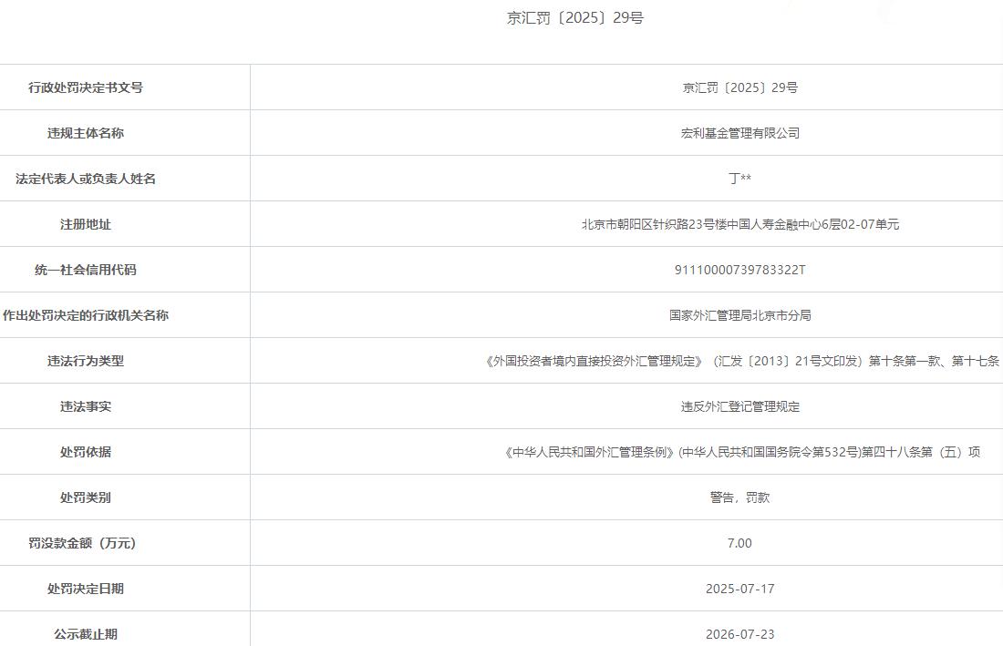 中国经济网北京7月25日讯23日,国家外汇管理局北京市分局发布京汇罚〔2025〕29号行政处罚。处罚信息显示,宏利基金管理有限公司因存在违反外汇登记管理规定的违法事实。具体违法行为类型涉及《外国投资者境内直接投资外汇管理规定》(汇发〔2013〕21号文印发)第十条第一款、第十七条。