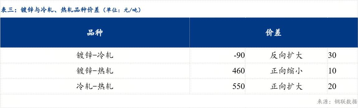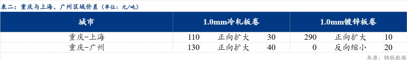 重庆、上海地区冷轧板卷区域价差扩大30元/吨;重庆、广州冷轧板卷区域价差扩大40元/吨。重庆、上海镀锌板卷区域价差扩大10元/吨;重庆、广州镀锌板卷区域价差反向缩小20元/吨。镀锌、冷轧品种价差反向扩大30元/吨;镀锌、热轧品种价差缩小10元/吨;冷轧、热轧品种价差扩大20元/吨。
