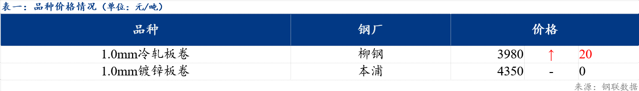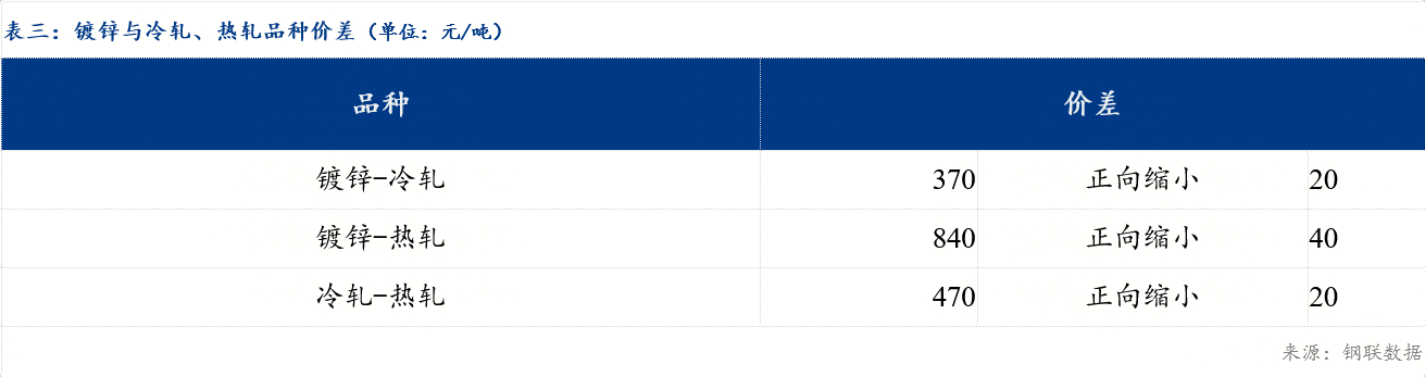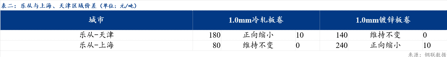 今日冷轧板卷乐从与天津价差较上一交易日收窄10元/吨,乐从与上海价差较上一交易日持平;镀锌板卷乐从与天津价差较上一交易日持平,与上海价差较上一交易日收窄10元/吨。品种价差方面,镀冷价差较上一交易日收窄20元/吨,镀热价差较上一交易日收窄40元/吨,冷热价差较上一交易日收窄20元/吨。