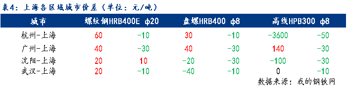 以主要品种螺纹钢来看,上海市场与杭州价差小幅收窄,价差为60元/吨。上海市场与东北区域价差小幅扩大,价差为20元/吨 。上海市场与华南区域价差小幅收窄,价差为40元/吨。上海市场与华中区域价差小幅收窄,价差为20元/吨。