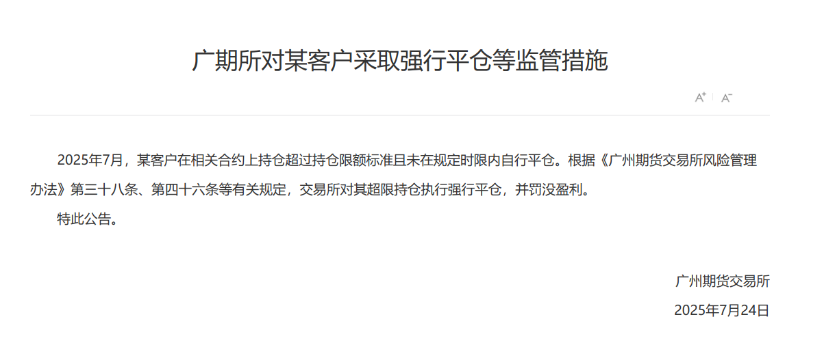 上证报中国证券网讯(李子健 记者 何治民)上证报获悉,广州期货交易所(以下简称广期所)7月24日发布自律监管公告,某客户在相关合约上持仓超过持仓限额标准且未在规定的时间内自行平仓,根据《广州期货交易所风险管理办法》第三十八条、四十六条等有关规定,交易所对其超过限仓标准的持仓执行了强行平仓并将盈利罚没。