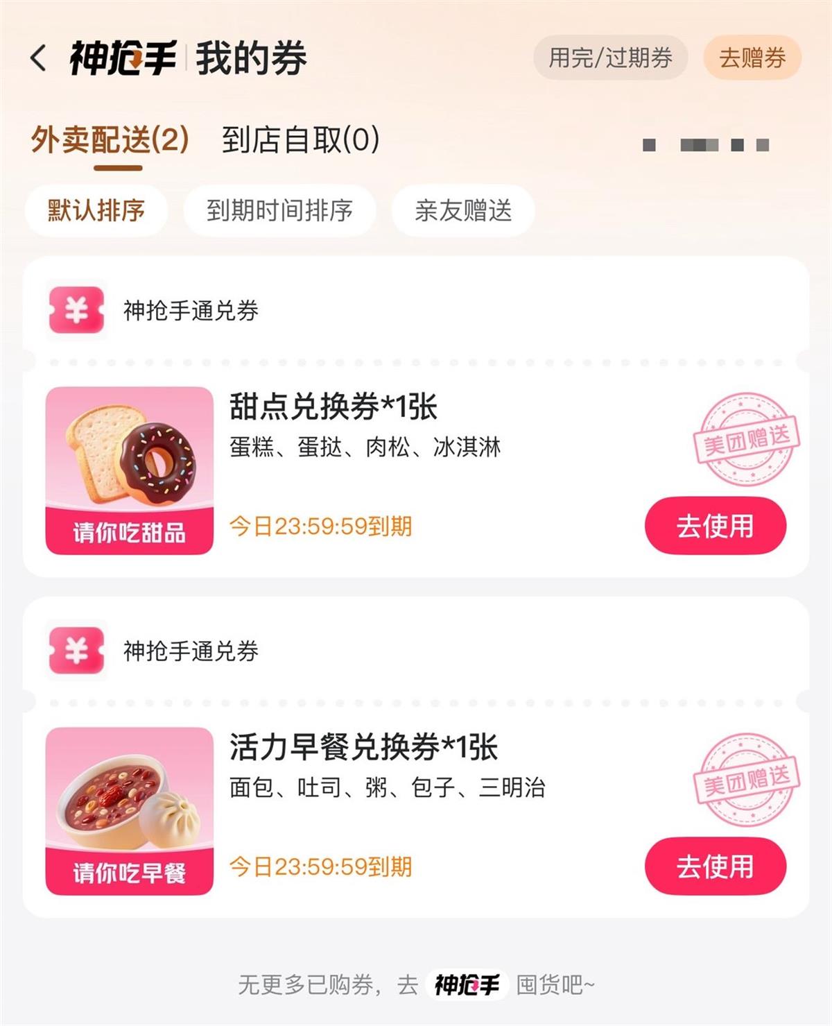 当日8时许,极目新闻记者打开美团外卖,弹出“外卖好礼已到账”红包,点开领取到外卖配送“甜点兑换券”“活力早餐兑换券”各1张。可兑换蛋糕、蛋挞、肉松、冰淇淋、面包、粥、三明治等品类,但仅限部分商家的指定甜点、早餐。