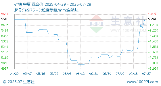 7月28日,生意社硅铁基准价为5557.14元/吨,与本月初(5158.57元/吨)相比,上涨了7.73%。