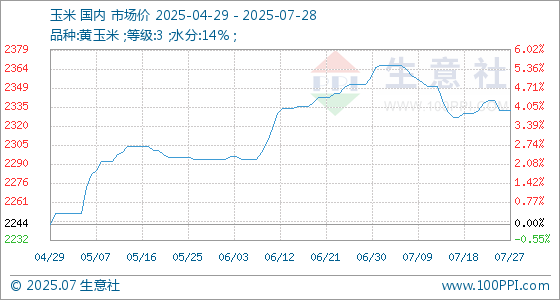 7月28日,生意社玉米基准价为2332.86元/吨,与本月初(2357.14元/吨)相比,下降了1.03%。