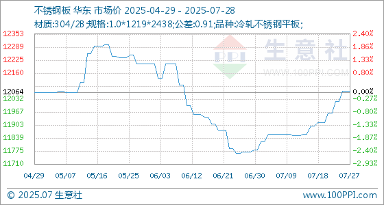 7月28日生意社不锈钢板基准价为12071.43元/吨