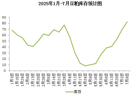 库存:从豆粕库存统计图可以看出,4月以来,受关税政策影响,进口大豆到港数量不断下降,豆粕库存再创历史,下滑至个位数。5月初进口大豆到港数量恢复,豆粕库存陆续回升。6月更是不断增加,一直上升至7月初,截止7月9日当周豆粕库存突破80万吨一线。库存压力倍增,豆粕行情弱势运行。