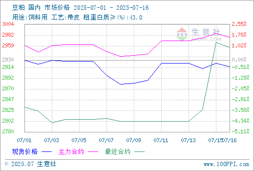 据生意社商品行情分析系统显示:7月以来,多空博弈,豆粕行情振荡下行。7月1日,豆粕市场均价2930元/吨,7月16日,豆粕市场均价2916元/吨,价格下跌0.48%。