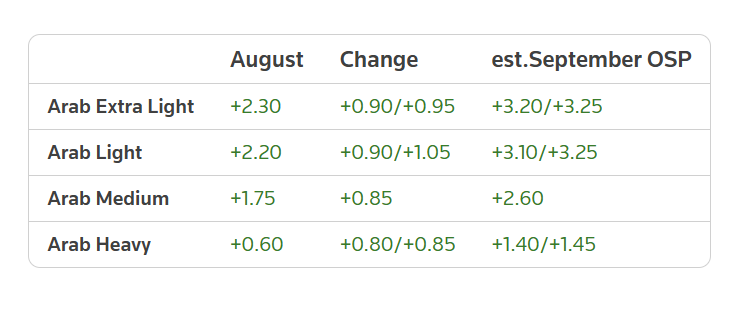 五位炼油行业消息人士在调查中预测,沙特9月旗舰产品阿拉伯轻质原油的官方售价可能较8月每桶上调90美分,达到每桶3.10至3.25美元的区间,这将是今年5月以来的最高水平。其他品级原油方面,阿拉伯特轻质、中质和重质原油的9月售价预计较8月每桶上涨80至95美分。