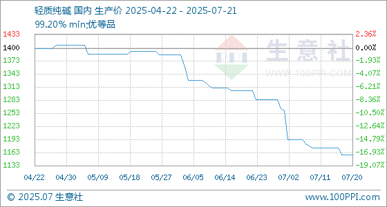 7月21日,生意社轻质纯碱基准价为1158.00元/吨,与本月初(1264.00元/吨)相比,下降了8.39%。