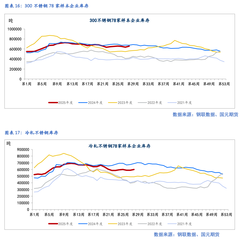 库存累库至高位,需求预期偏弱。7月10日,全国主流市场不锈钢89仓库口径社会总库存116.75万吨,周环比上升0.93%。其中冷轧不锈钢库存总量63.72万吨,周环比上升1.86%,热轧不锈钢库存总量53.03万吨,周环比下降0.17%。下游需求有限,采购偏谨慎,整体消化节奏较为缓慢。据产业在线最新发布的三大白电排产报告显示,2025年7月空冰洗排产合计总量共计2960万台,较去年同期生产实绩下降2.6%。