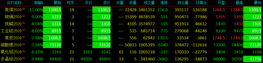 截至下午收盘,焦煤、玻璃、纯碱、工业硅、焦炭、碳酸锂期货主力合约均收于跌停板。其中,焦煤期货主力合约跌幅为11%,领跌国内期市。