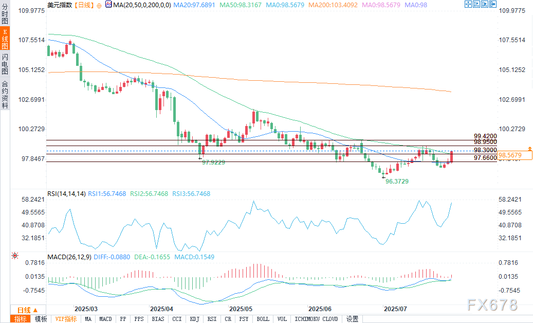 汇通财经APP讯——周一(7月28日)美盘时段,美元指数(DXY)攀升至98.53,涨幅达0.88%,此前美国与欧盟达成关税协议,缓解了市场对更广泛贸易战的担忧。